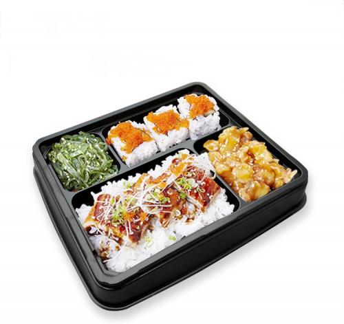 This customized PS black plastic 4 compartment rectangular lunch box with lid is an exquisite and practical custom tableware. It is made of high-quality PS plastic material with a sleek and elegant design, suitable for various occasions.