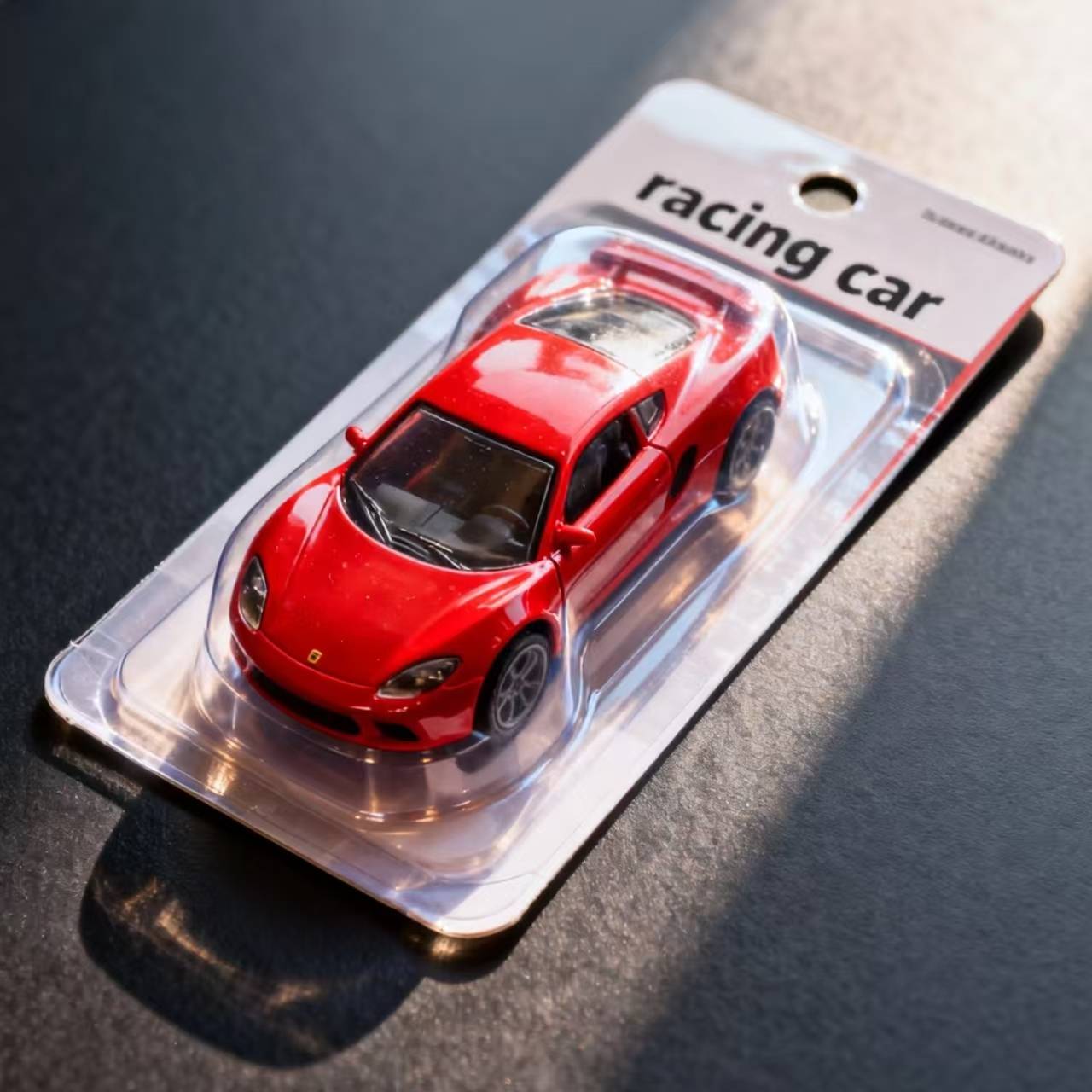 The vacuum formed packaging of this racing toy in front of us is a perfect example of precision molding. The transparent shell tightly wraps around the red car, with each arc accurately corresponding; The logo lettering is clear and eye-catching, with even and neat perforations on the edges. When light passes through the material, the overall appearance is soft and transparent, and the dark background highlights its modernity and product charm.