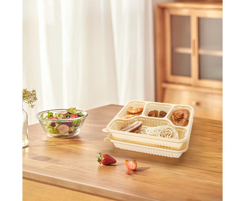 Corporate group meals/school canteens: used for the packaging of corporate employee meals and school student meals, with 4 compartments for reasonable combination of main and side dishes, clean and hygienic, convenient to carry, biodegradable materials that meet campus and corporate environmental requirements, and reduce white pollution.
