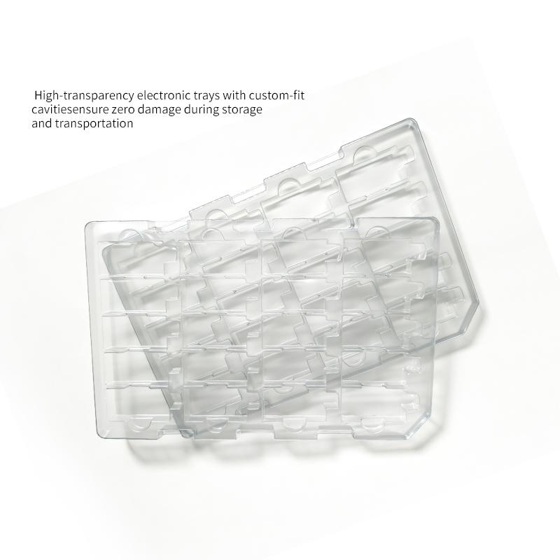 A:PET material has strong toughness, and conventional trays can withstand a weight of 50-100g per grid (specific thickness can be adjusted according to customization). Small electronic parts will not deform during daily storage and transportation, and can effectively resist slight compression and impact.